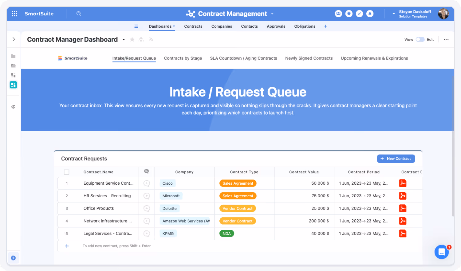 Experience how SmartSuite modernizes sourcing, vendor onboarding, contracting, and renewal governance in one unified workspace.