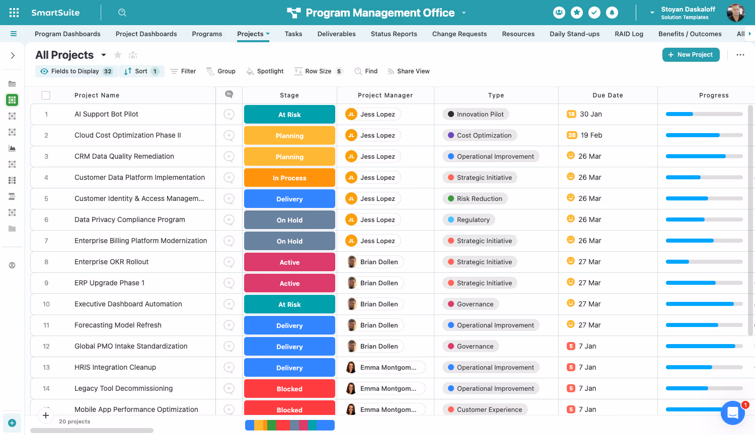 SmartSuite helps you consolidate scattered tools into one connected platform—so teams can manage risk, IT, projects, and operations without switching systems.