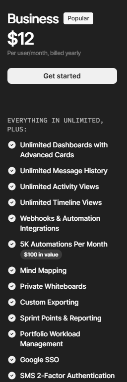 ClickUp positions its business plan as its most preferred plant for medium—to large-sized businesses. In addition to more control over workspace customization, the plan lifts nearly all use caps and offers unlimited whiteboards, mind maps, dashboards, and views.