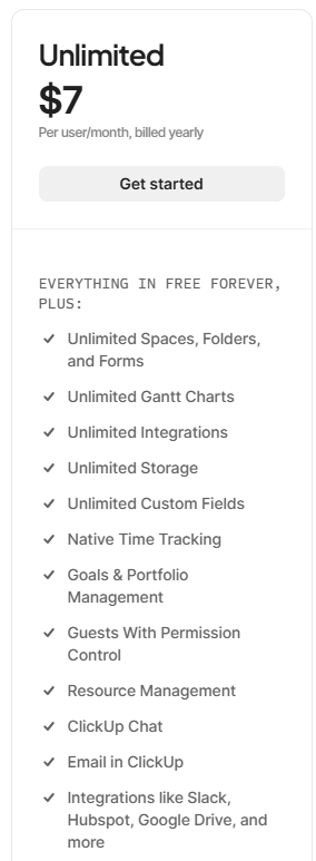 The unlimited plan starts at a low price of $10 per user/month (billed monthly) and is best suited for small teams. This plan solves the biggest limitation of free plans, i.e., no permission for guests. You can manage permission levels to share your workspaces across stakeholders. Oyster additions include unlimited storage, spaces, and Gantt charts.