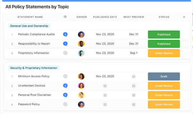 - Policy Management: Assign policy owners, manage versions, and track read receipts and acknowledgements.