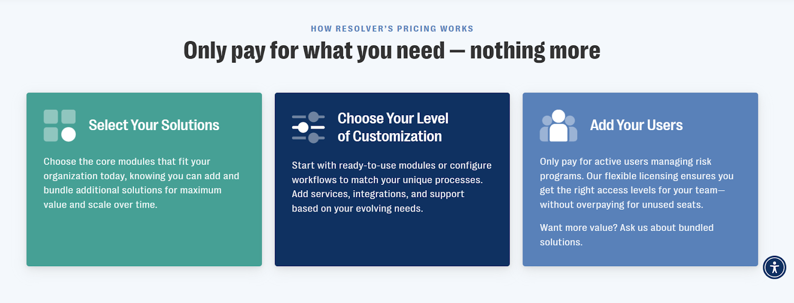 Instead, pricing is modular and user-based, depending on which modules you adopt (e.g. ERM, RMIS, audit, TPRM) plus service and implementation fees.