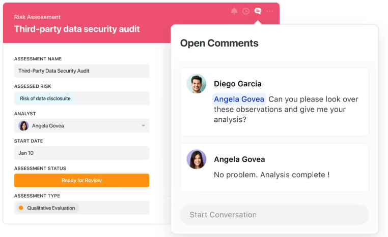 - Real-time collaboration: Connect every stakeholder in one live workspace where discussions, updates, and actions happen instantly, so teams can respond to risks faster and stay in sync without endless email threads.