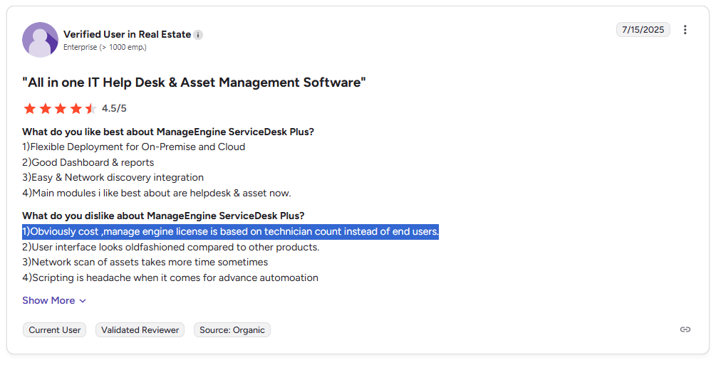 ‘’Obviously, cost, ManageEngine license is based on technician count instead of end users.’’ – G2 Review.