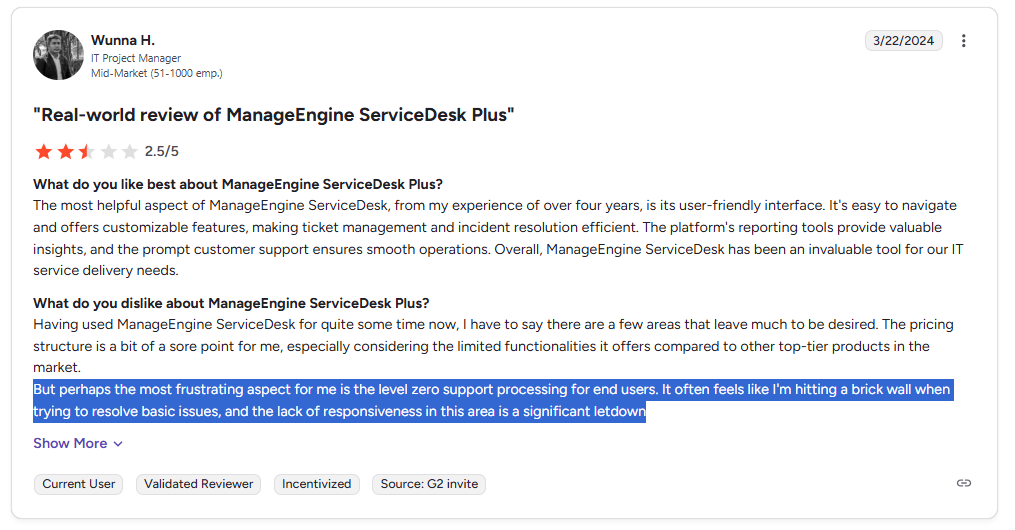 One G2 review remembers their experience with ManageEngine’s customer support as ‘’hitting a brick wall’’ when trying to resolve their issues and mentions how dissatisfied they are with the lack of responsiveness on the solution’s side.