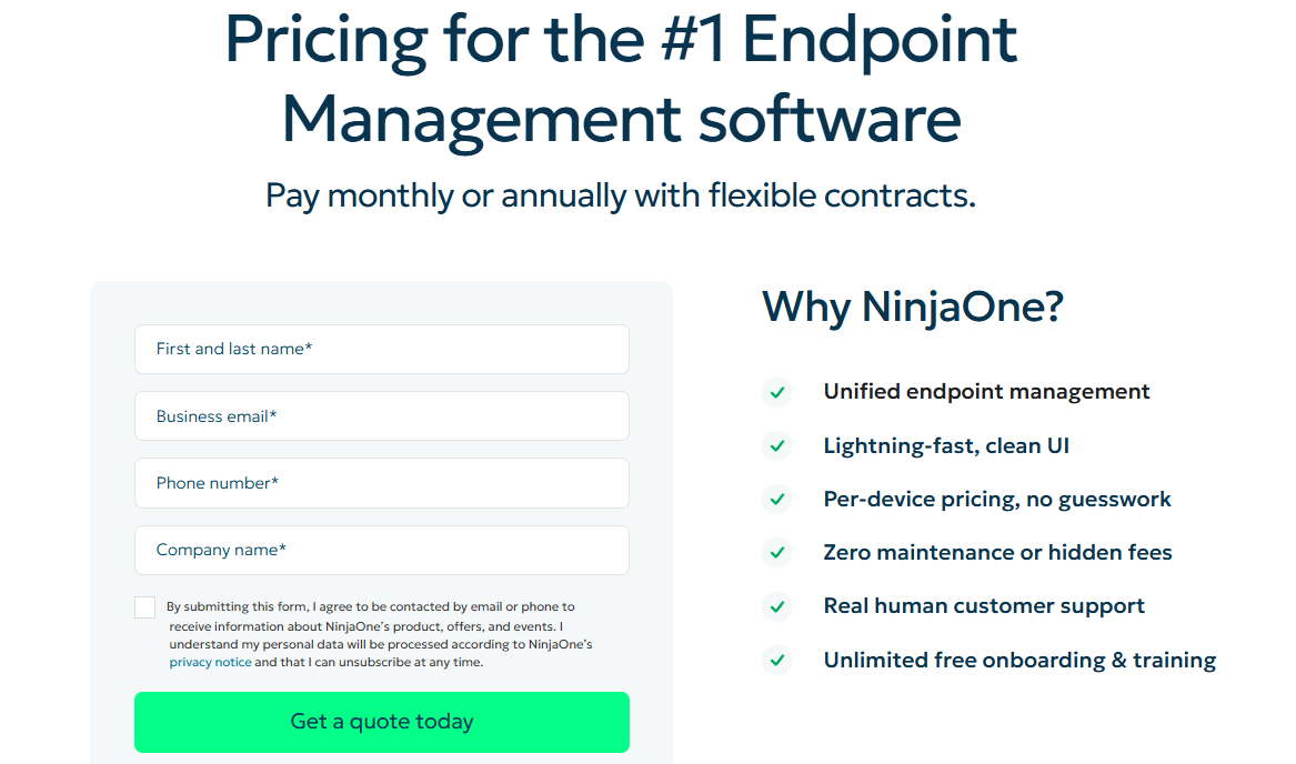 However, its website does state that NinjaOne follows a per‑device pricing model with monthly or annual contracts, with the pricing depending primarily on the number of endpoints you manage.