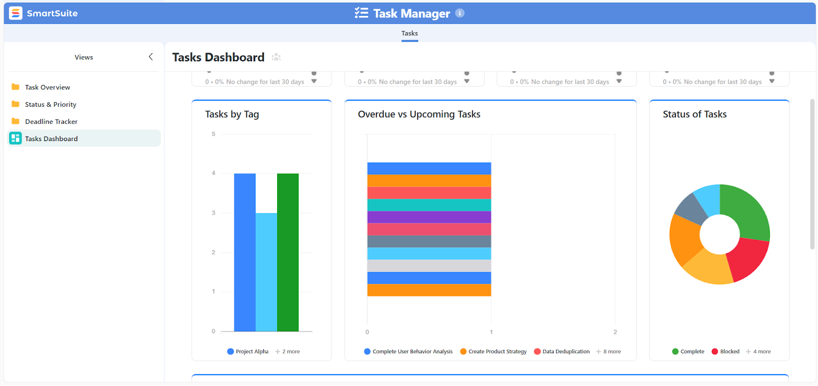 SmartSuite is designed to be the system where work actually gets planned, executed, and tracked without splitting effort across separate project tools, databases, and reporting layers.