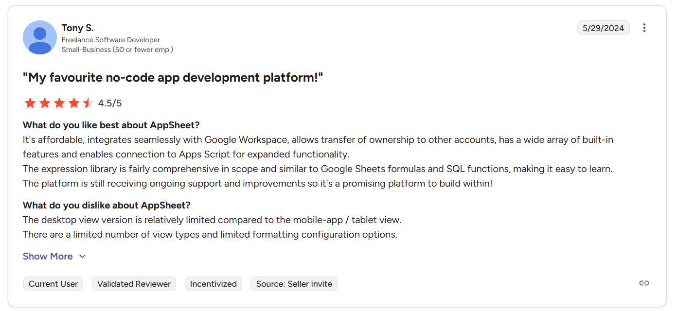 - Ease of use: Users consistently highlight how easy it is to build and deploy apps without writing code. Many describe AppSheet as intuitive, quick to learn, and significantly faster to implement than other low-code platforms like PowerApps.