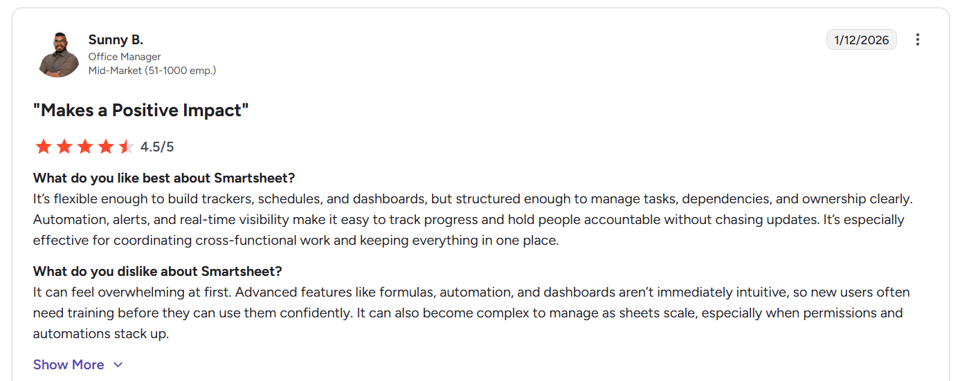 - Smartsheet works best when your team already thinks in spreadsheets. It adds structure, automation, and reporting on top of a grid-based model, which makes it effective for tracking tasks, dependencies, and operational metrics, but less flexible once work needs to move beyond sheet logic.