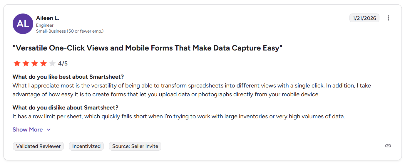 “What I appreciate most is the versatility of being able to transform spreadsheets into different views with a single click. In addition, I take advantage of how easy it is to create forms that let you upload data or photographs directly from your mobile device.” - G2 Review