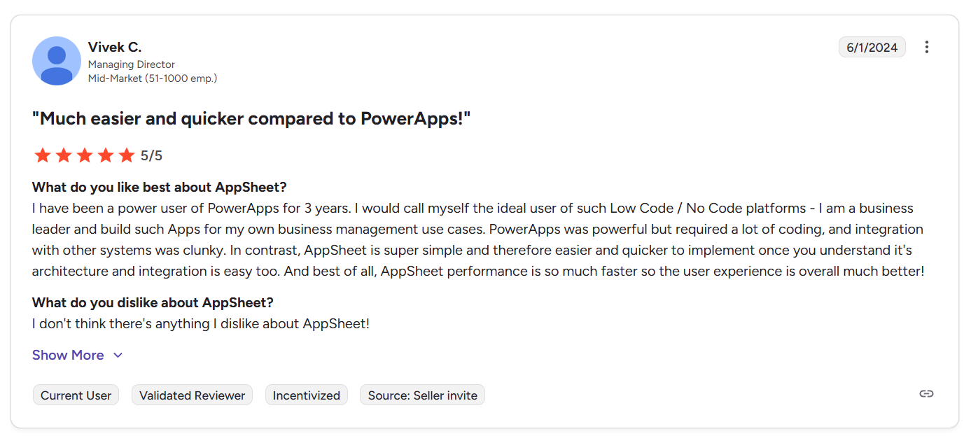 “I have been a power user of PowerApps for 3 years. I would call myself the ideal user of such Low Code / No Code platforms - I am a business leader and build such Apps for my own business management use cases. PowerApps was powerful but required a lot of coding, and integration with other systems was clunky. In contrast, AppSheet is super simple and therefore easier and quicker to implement once you understand it's architecture and integration is easy too. And best of all, AppSheet performance is so much faster so the user experience is overall much better!” - G2 Review