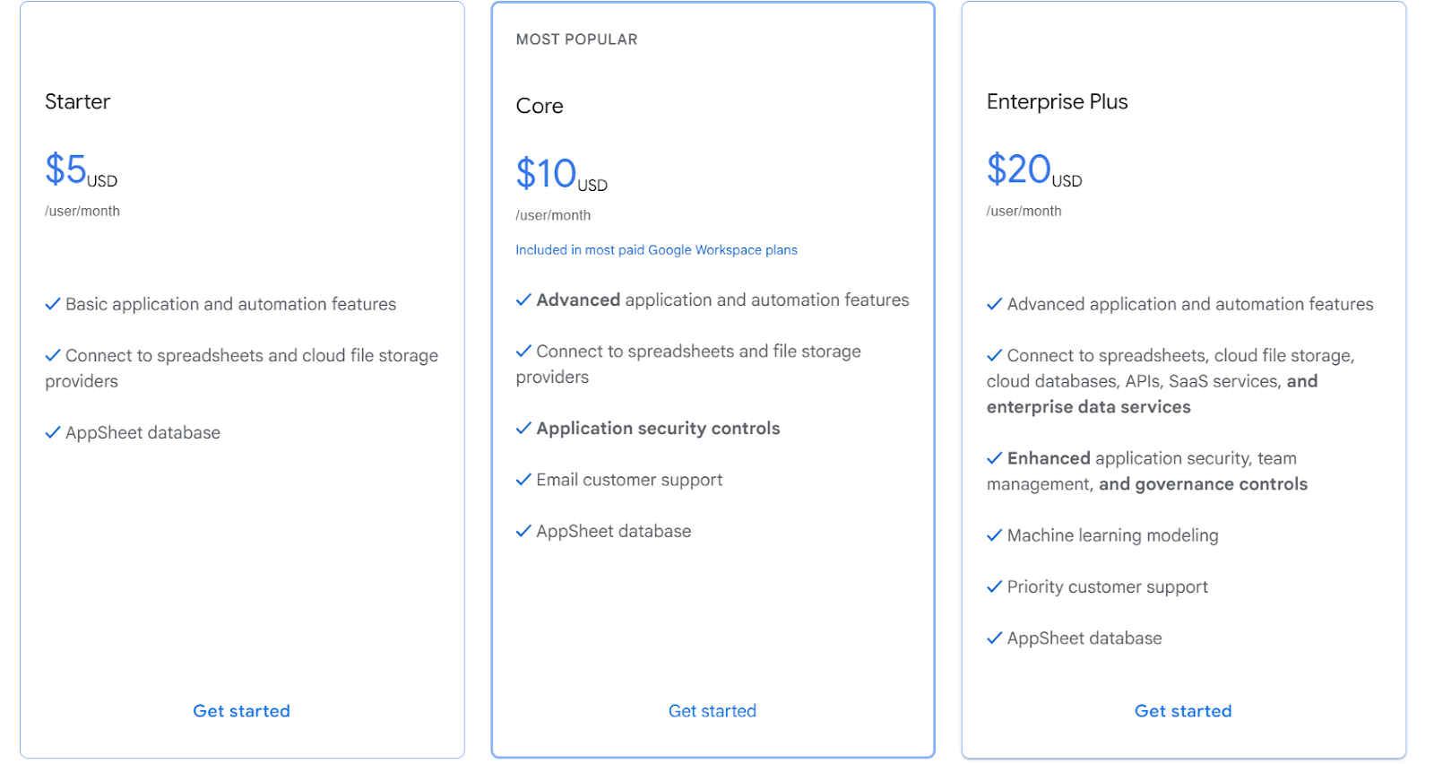- Core: $10/user/month, adds advanced app and automation features, application security controls, email support, and broader use of the AppSheet database.