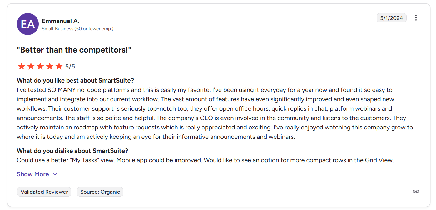 “I've tested SO MANY no-code platforms and this is easily my favorite. I've been using it everyday for a year now and found it so easy to implement and integrate into our current workflow. The vast amount of features have even significantly improved and even shaped new workflows. Their customer support is seriously top-notch too, they offer open office hours, quick replies in chat, platform webinars and announcements. The staff is so polite and helpful. The company's CEO is even involved in the community and listens to the customers. They actively maintain a roadmap with feature requests which is really appreciated and exciting. I've really enjoyed watching this company grow to where it is today and am actively keeping an eye for their informative announcements and webinars.” - G2 Review