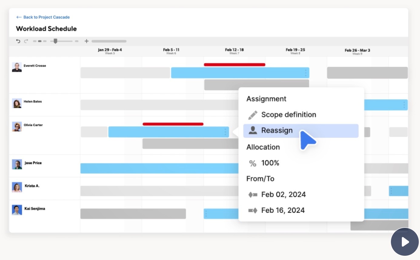 Smartsheet provides you with a workload heat map as a visual snapshot of your team’s availability, while the workload schedule offers an expanded view of project assignments.