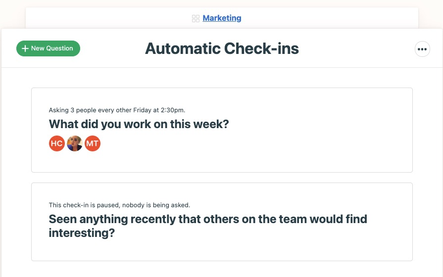 Automatic check-ins are scheduled questions for your team to reduce the need for status meetings (which can be annoying for senior leadership to constantly ‘’touchbase’’).