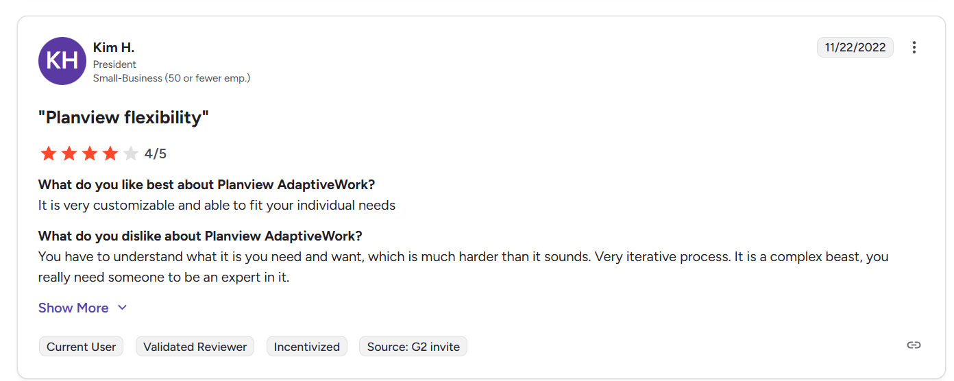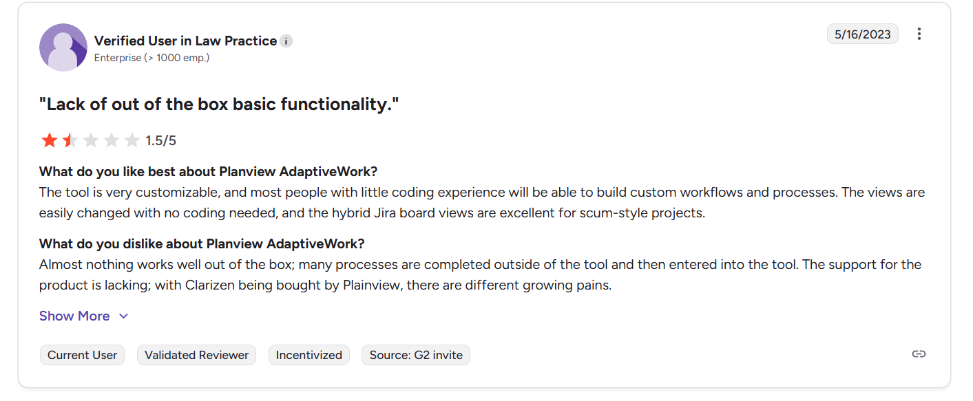 “Almost nothing works well out of the box; many processes are completed outside of the tool and then entered into the tool. The support for the product is lacking; with Clarizen being bought by Plainview, there are different growing pains.” - G2 Review