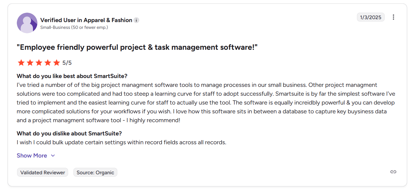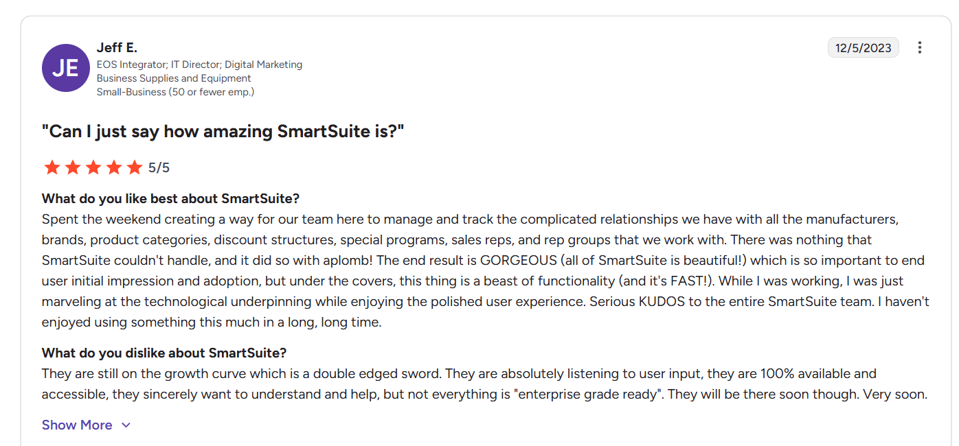 “I've tried a number of the big project management software tools to manage processes in our small business. Other project management solutions were too complicated and had too steep a learning curve for staff to adopt successfully. Smartsuite is by far the simplest software I've tried to implement and the easiest learning curve for staff to actually use the tool. The software is equally incredibly powerful & you can develop more complicated solutions for your workflows if you wish. I love how this software sits in between a database to capture key business data and a project management software tool - I highly recommend!” - G2 Review