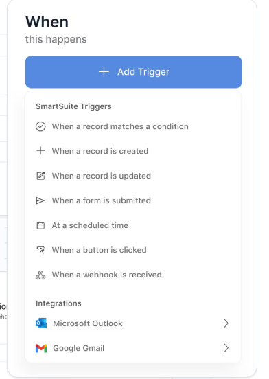 - Real-time triggers: Launch automations based on record updates, dates, schedules, button clicks, or inbound webhooks.