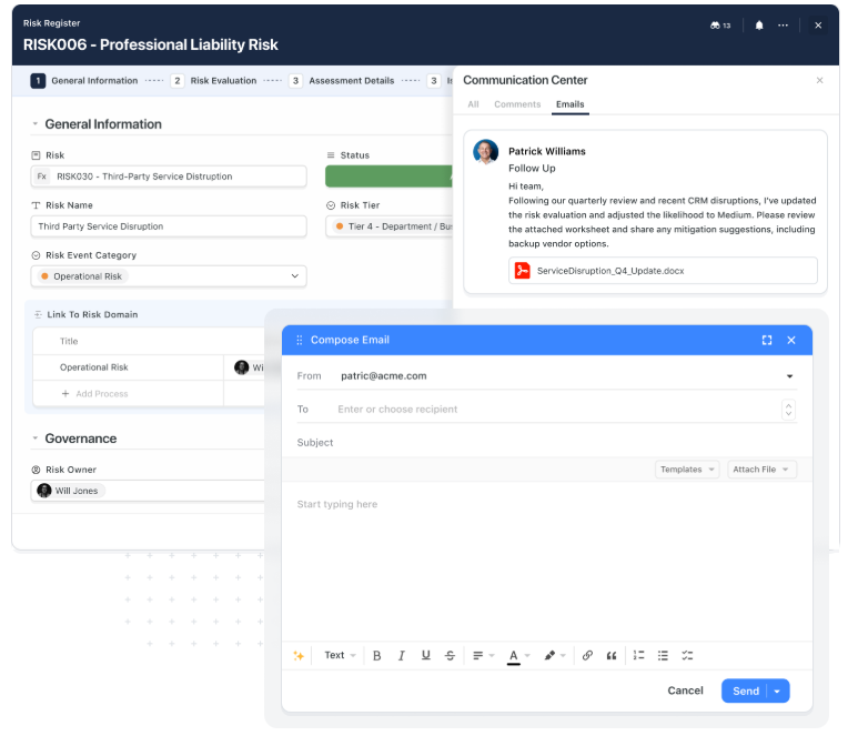 - Email inside the workflow: Send and receive stakeholder emails directly from records so communication stays visible to the entire team instead of scattered across inboxes.