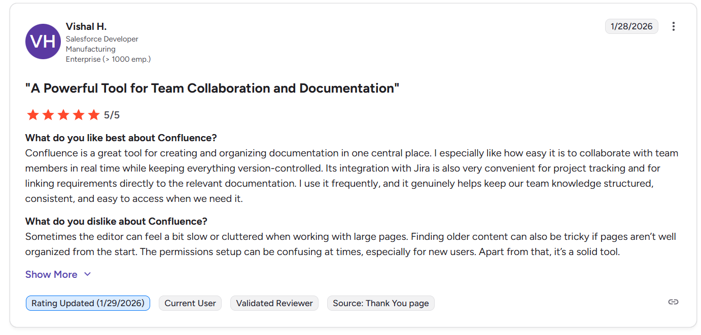 “Confluence is a great tool for creating and organizing documentation in one central place. I especially like how easy it is to collaborate with team members in real time while keeping everything version-controlled. Its integration with Jira is also very convenient for project tracking and for linking requirements directly to the relevant documentation. I use it frequently, and it genuinely helps keep our team knowledge structured, consistent, and easy to access when we need it.” - G2 Review