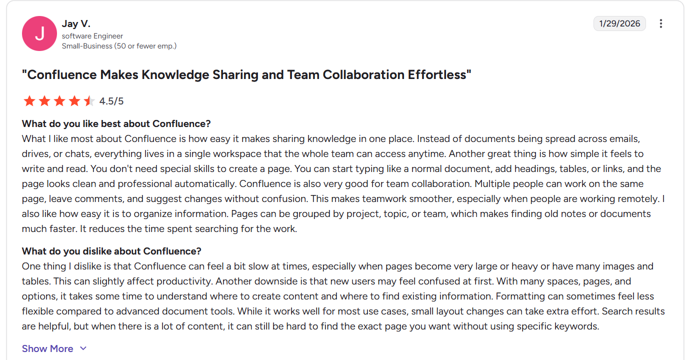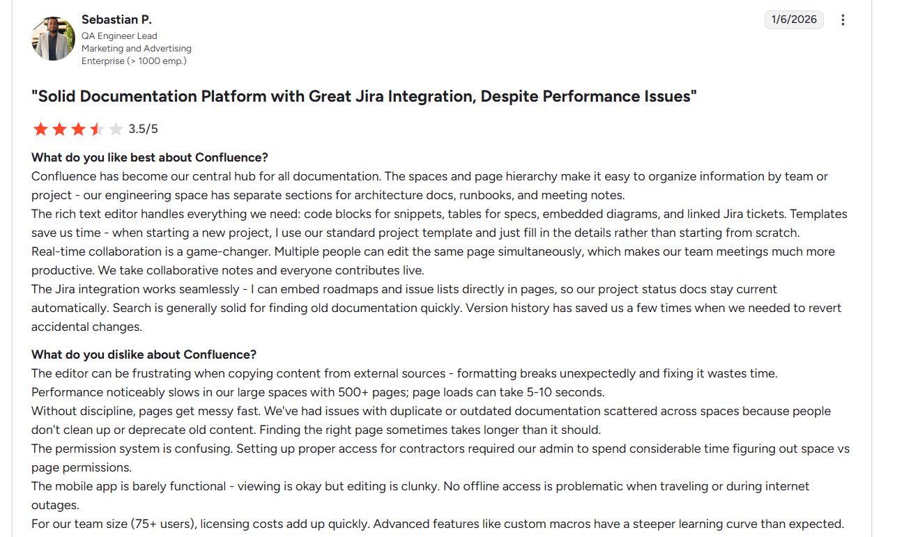 “One thing I dislike is that Confluence can feel a bit slow at times, especially when pages become very large or heavy or have many images and tables. This can slightly affect productivity. Another downside is that new users may feel confused at first. With many spaces, pages, and options, it takes some time to understand where to create content and where to find existing information. Formatting can sometimes feel less flexible compared to advanced document tools. While it works well for most use cases, small layout changes can take extra effort. Search results are helpful, but when there is a lot of content, it can still be hard to find the exact page you want without using specific keywords.” - G2 Review