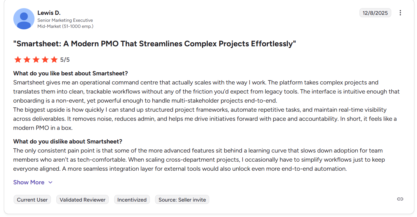 “What I like best about Smartsheet is how it combines power with simplicity: its spreadsheet-style layout makes it very easy to use, even for non-technical users, and implementation is quick since existing Excel or Google Sheets files can be imported right away. The platform is used frequently because it supports everyday task tracking as well as full project management, which keeps teams working in one place. It offers a strong number of features like automation, dashboards, reporting, and Gantt charts without feeling overwhelming. Integration with tools such as Microsoft 365, Google Workspace, Slack, and Jira is smooth, helping teams avoid data silos. On top of that, customer support, documentation, and community resources make it easier to solve issues and learn the system efficiently.” - G2 Review