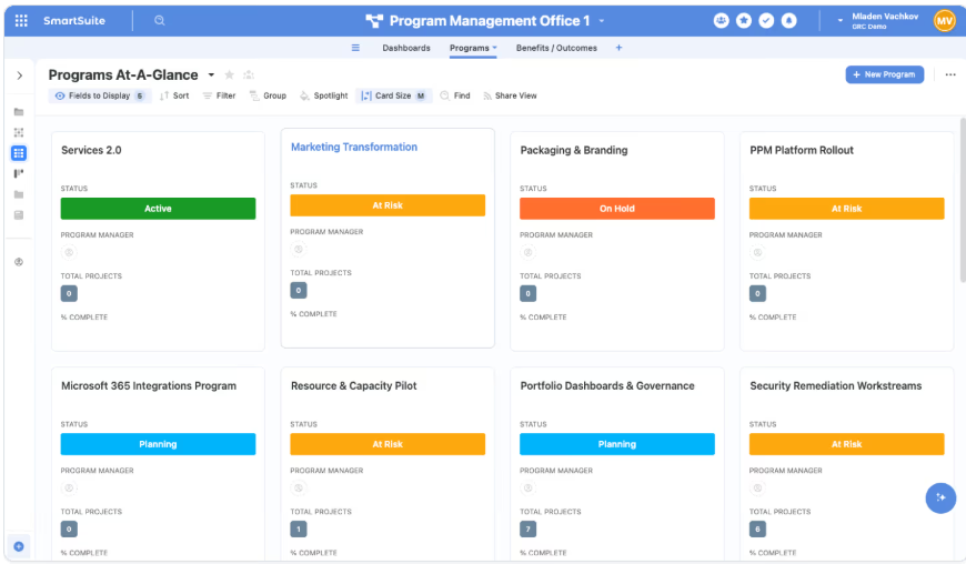 - Built-in solution suites: SmartSuite comes with purpose-built solution areas for Projects & Portfolios, Business Operations, IT Service Management (ITSM), and GRC, so teams can start with one area and expand as workflows connect.
