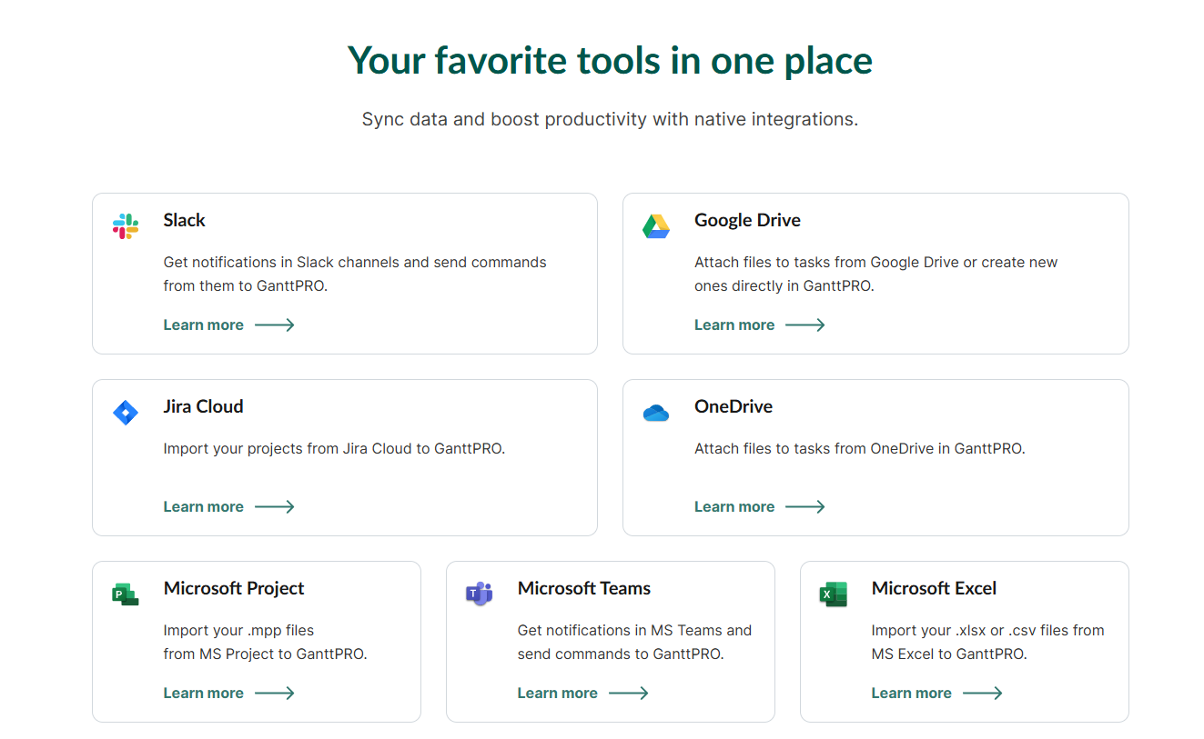 GanttPRO provides a focused set of integrations designed to keep project timelines connected with the tools teams already use for communication and file management.
