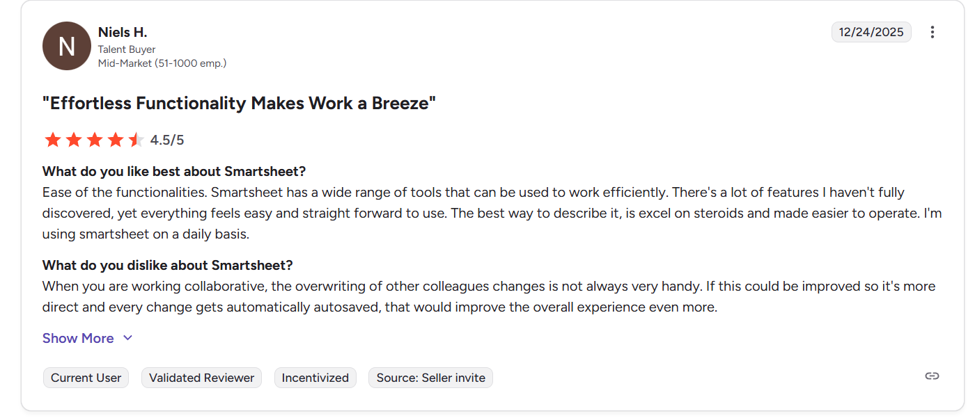 “I use Smartsheet for project management and tracking tasks, and it helps me organize timelines, assign responsibilities, and monitor progress across different teams. I love its flexibility, as you can customize sheets to match different frameworks, automate reminders, and get a clear view of timelines and progress. The customization lets us tailor each sheet to fit different projects instead of forcing one rigid structure on everything. We can add the columns, statuses, and workflows that actually match how our team works. Additionally, the initial setup was fairly easy; creating sheets and inviting team members was straightforward.” - G2 Review