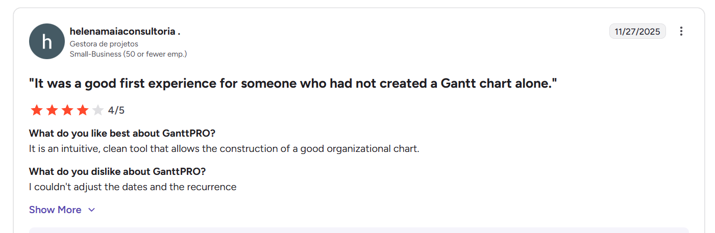 “What I like best about GanttPRO is its remarkable ability to turn complex project data into a clear, actionable visual roadmap. Many tools focus either on simple lists or overly complex spreadsheets, but GanttPRO hits the "sweet spot" of professional project management.