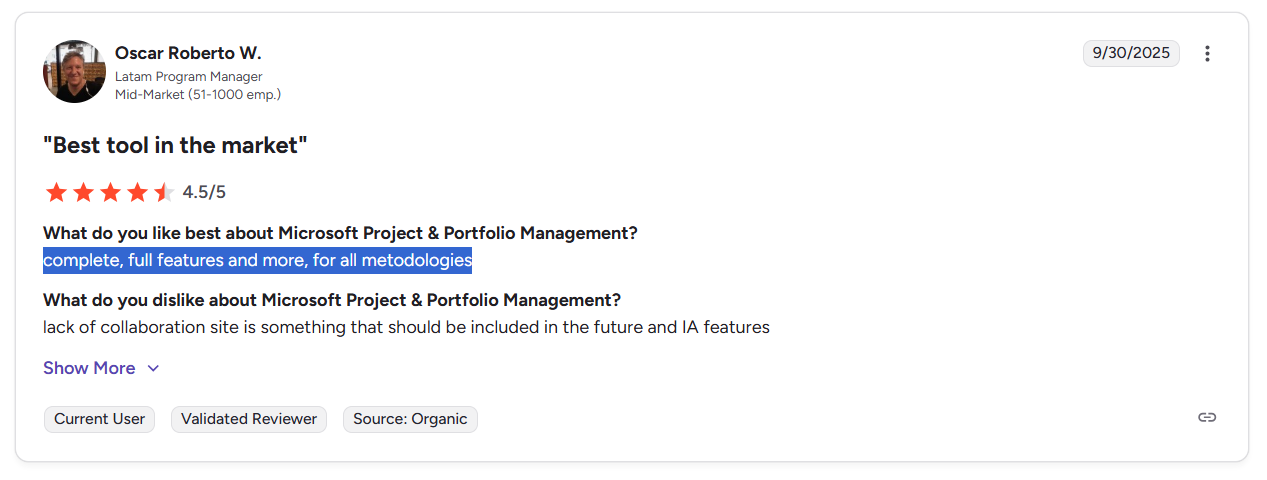 ‘’The most challenging aspect of Microsoft Project & Portfolio Management (PPM) is its complexity and steep learning curve, making it difficult for organizations to fully grasp and utilize its features effectively.’’ G2 Review.