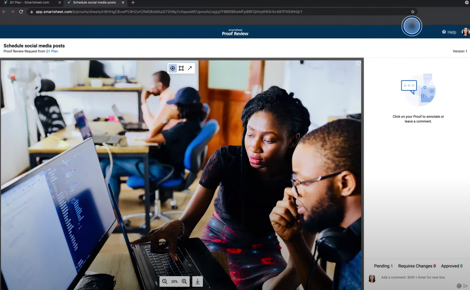 Smartsheet’s proofing feature helps teams review and approve content without jumping between tools.
