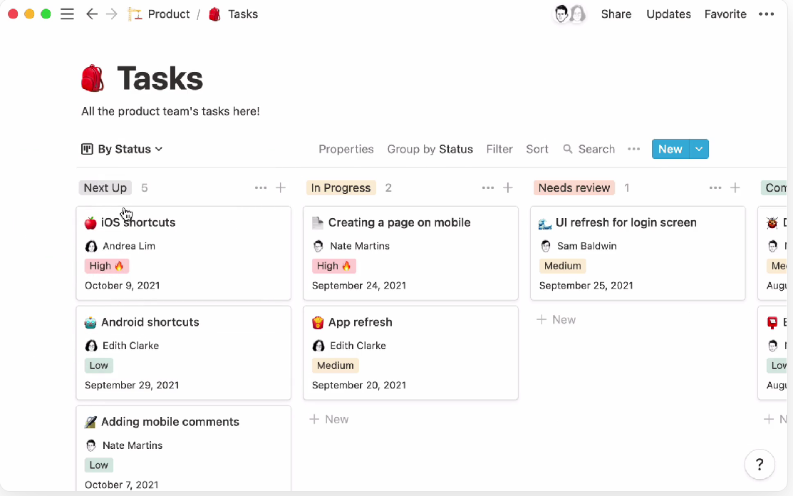 Tasks live inside customizable databases where you can add properties like owner, priority, due date, status, or team, then view that same data as lists, tables, Kanban boards, calendars, or timelines.