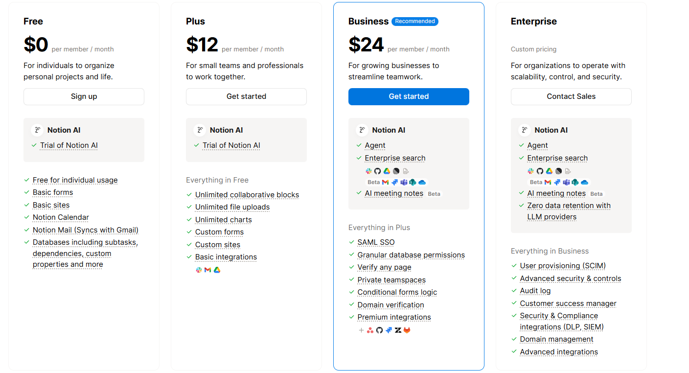 - Business: $24 per user/month, includes everything in Plus, plus advanced permissions, private teamspaces, page verification, SAML SSO, conditional forms, premium integrations, and AI features.