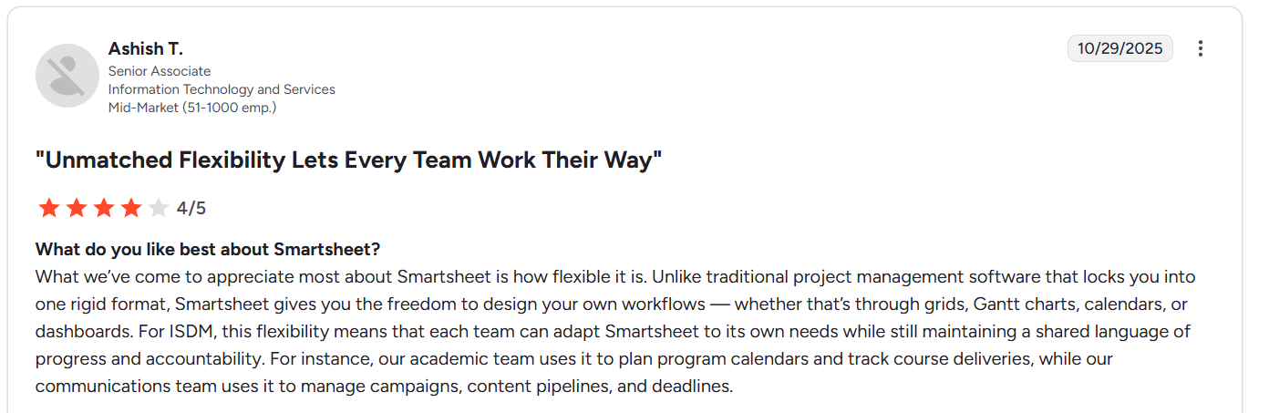 “What we’ve come to appreciate most about Smartsheet is how flexible it is. Unlike traditional project management software that locks you into one rigid format, Smartsheet gives you the freedom to design your own workflows — whether that’s through grids, Gantt charts, calendars, or dashboards.” - G2 Review