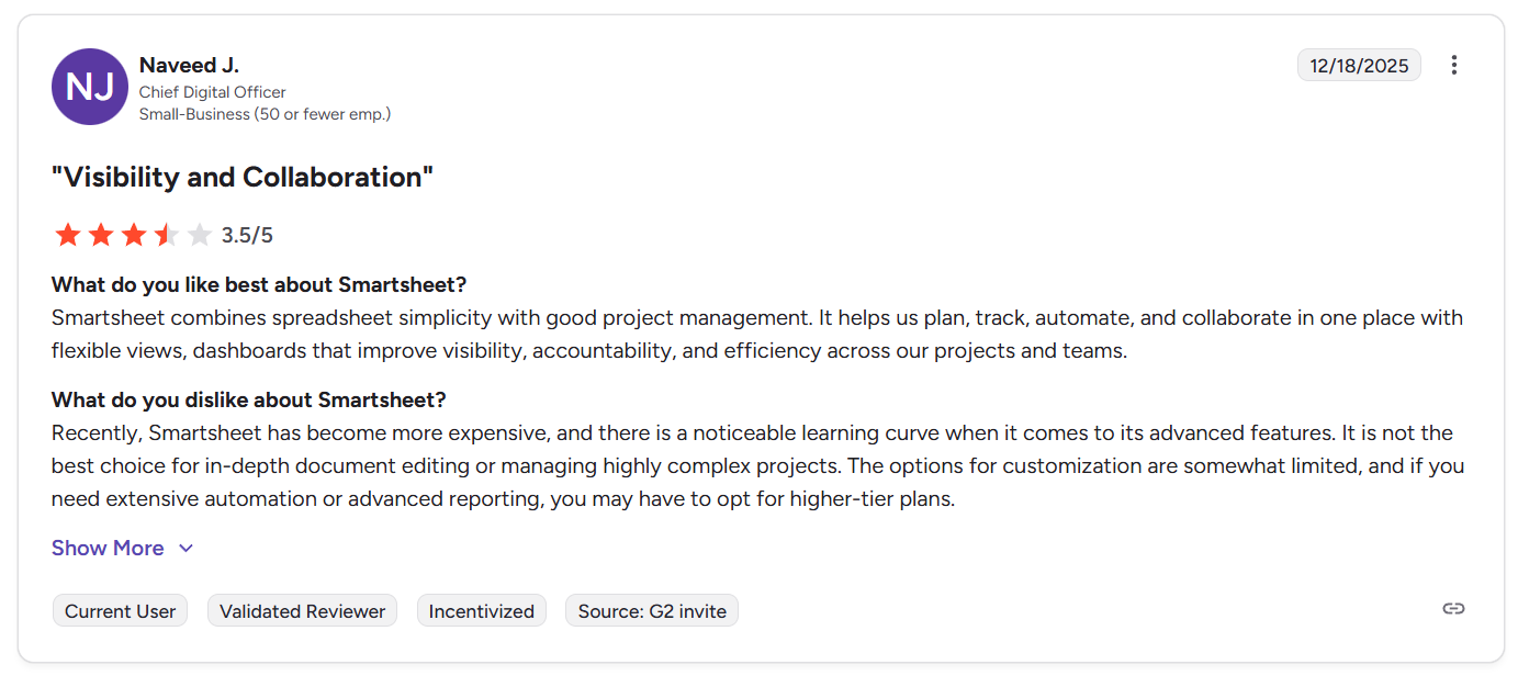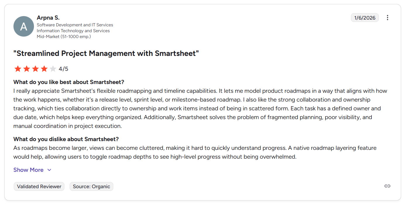 “I also like the strong collaboration and ownership tracking, which ties collaboration directly to ownership and work items instead of being in scattered form. Each task has a defined owner and due date, which helps keep everything organized. Additionally, Smartsheet solves the problem of fragmented planning, poor visibility, and manual coordination in project execution.” - G2 Review