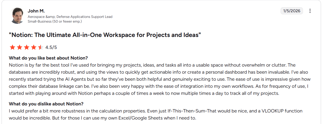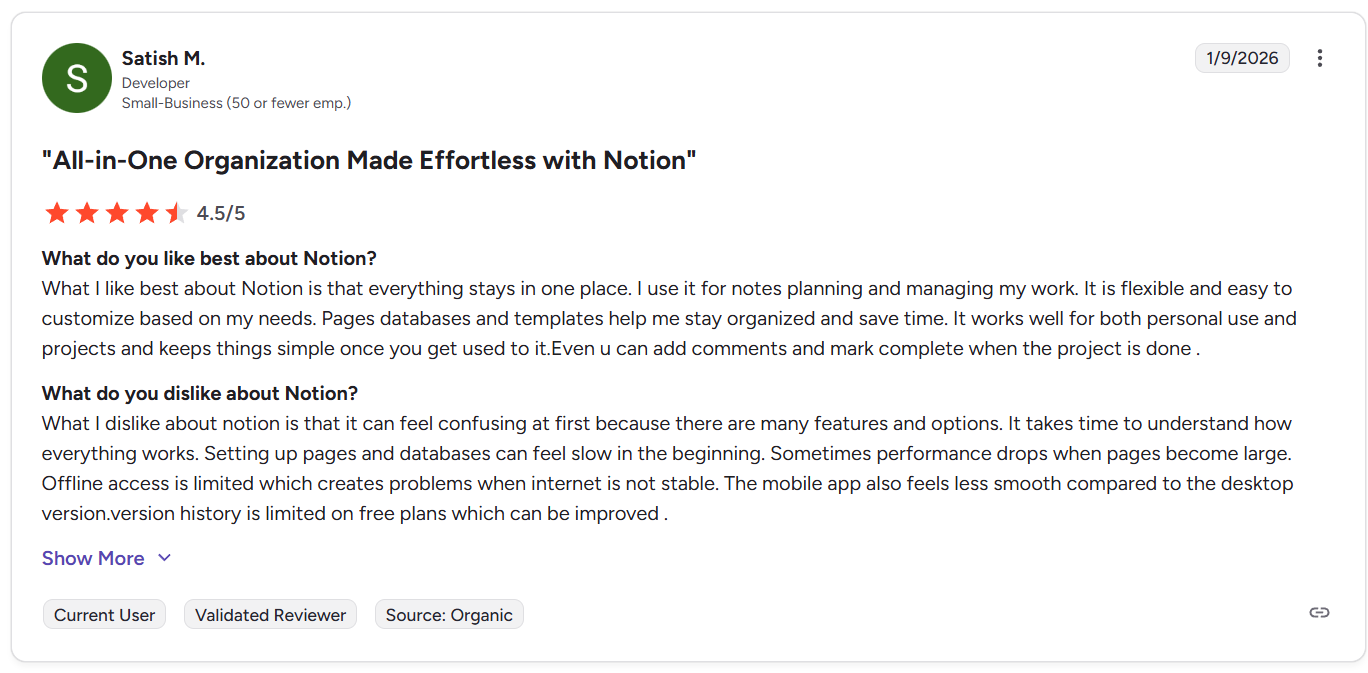“What I like best about Notion is that everything stays in one place. I use it for notes planning and managing my work. It is flexible and easy to customize based on my needs. Pages databases and templates help me stay organized and save time.” - G2 Review