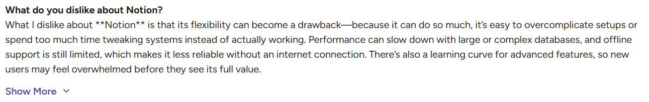 “What I dislike about **Notion** is that its flexibility can become a drawback—because it can do so much, it’s easy to overcomplicate setups or spend too much time tweaking systems instead of actually working. Performance can slow down with large or complex databases, and offline support is still limited, which makes it less reliable without an internet connection. There’s also a learning curve for advanced features, so new users may feel overwhelmed before they see its full value.” - G2 Review