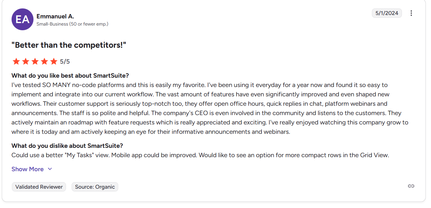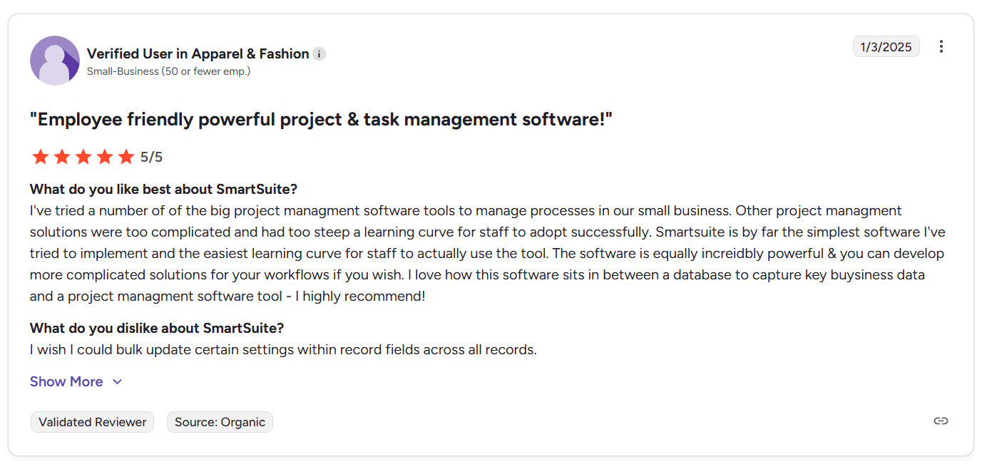 “I've tried a number of the big project management software tools to manage processes in our small business. Other project management solutions were too complicated and had too steep a learning curve for staff to adopt successfully. SmartSuite is by far the simplest software I've tried to implement and the easiest learning curve for staff to actually use the tool. The software is equally incredibly powerful & you can develop more complicated solutions for your workflows if you wish. I love how this software sits in between a database to capture key business data and a project management software tool - I highly recommend!” - G2 Review