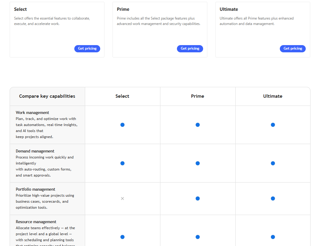 • Advanced Work Management: Custom pricing, designed for organizations managing large portfolios and complex, cross-system workflows. Includes everything in Enterprise, plus control center, dynamic view, data shuttle, DataMesh, calendar and pivot apps, Salesforce and Jira connectors, and premium support.
