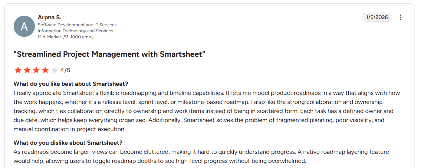 “I really appreciate Smartsheet's flexible roadmapping and timeline capabilities. It lets me model product roadmaps in a way that aligns with how the work happens, whether it's a release level, sprint level, or milestone-based roadmap. I also like the strong collaboration and ownership tracking, which ties collaboration directly to ownership and work items instead of being in scattered form. Each task has a defined owner and due date, which helps keep everything organized. Additionally, Smartsheet solves the problem of fragmented planning, poor visibility, and manual coordination in project execution.” - G2 Review