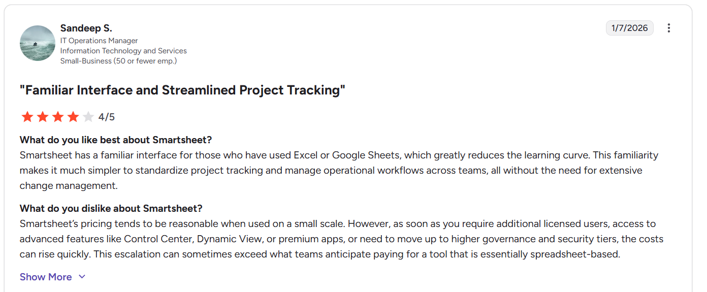 • Smartsheet (4.4★ on G2) is loved for its familiar spreadsheet-style workflows, strong collaboration, and practical automation, but users often flag rising licensing costs, performance issues with large sheets, and a steeper learning curve as teams scale.