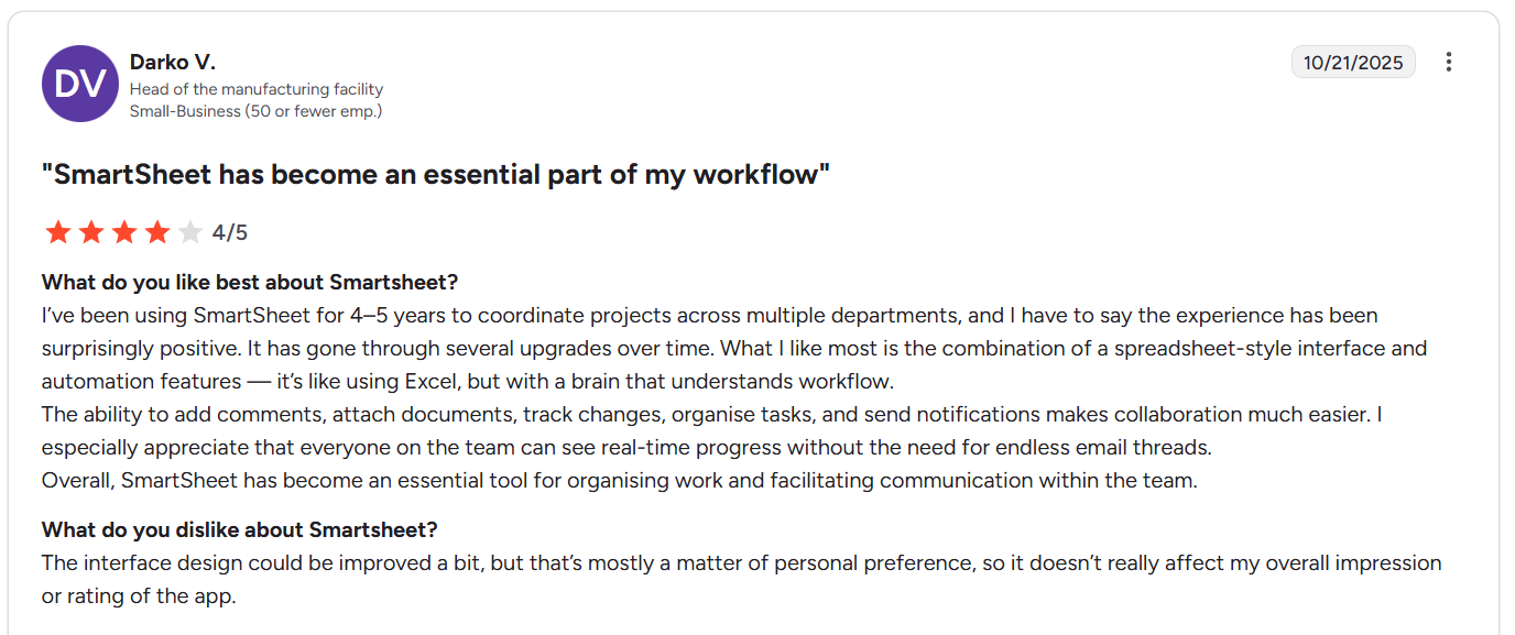Overall, SmartSheet has become an essential tool for organising work and facilitating communication within the team.” - G2 Review