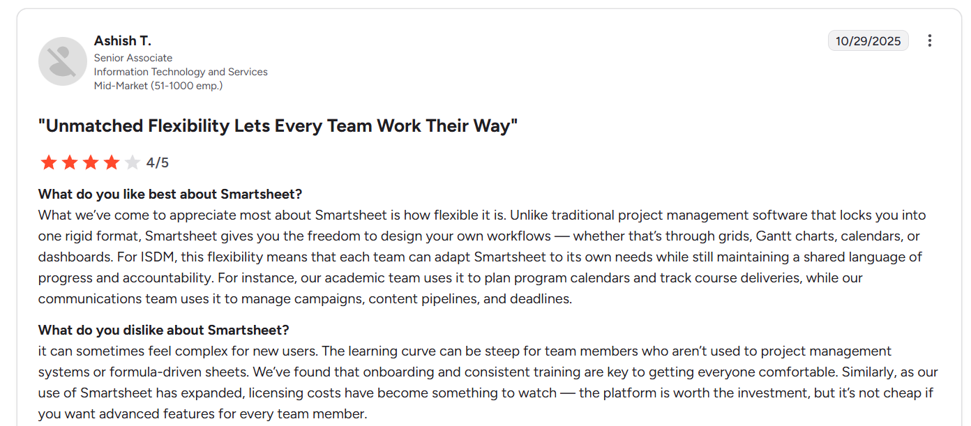 “it can sometimes feel complex for new users. The learning curve can be steep for team members who aren’t used to project management systems or formula-driven sheets. We’ve found that onboarding and consistent training are key to getting everyone comfortable. Similarly, as our use of Smartsheet has expanded, licensing costs have become something to watch — the platform is worth the investment, but it’s not cheap if you want advanced features for every team member.” - G2 Review