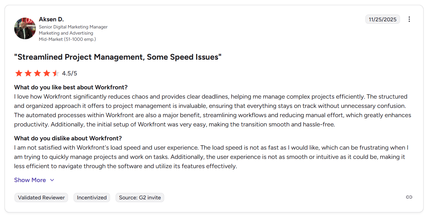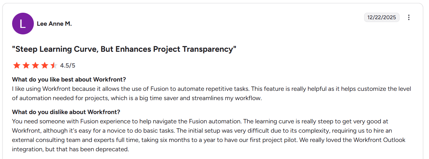 “While Workfront is extremely powerful, the user interface and personalization options are somewhat limited. I wish there were more flexibility with visual customization such as colors, headers, fonts, and company branding to improve usability and make the experience feel more modern. Additionally, the learning curve can be steep for new users, especially given how many features and configuration options are available.” - G2 Review