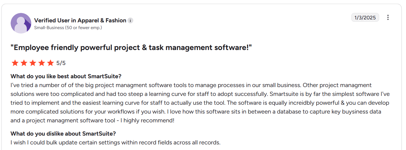 “I've tried a number of the big project management software tools to manage processes in our small business. Other project management solutions were too complicated and had too steep a learning curve for staff to adopt successfully. Smartsuite is by far the simplest software I've tried to implement and the easiest learning curve for staff to actually use the tool. The software is equally incredibly powerful & you can develop more complicated solutions for your workflows if you wish. I love how this software sits in between a database to capture key business data and a project management software tool - I highly recommend:” - G2 Review