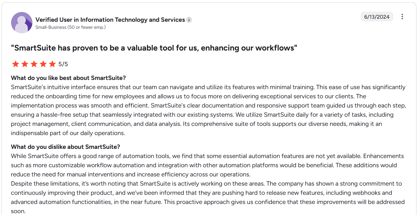 Despite these limitations, it’s worth noting that SmartSuite is actively working on these areas. The company has shown a strong commitment to continuously improving their product, and we’ve been informed that they are pushing hard to release new features, including webhooks and advanced automation functionalities, in the near future. This proactive approach gives us confidence that these improvements will be addressed soon.” - G2 Review