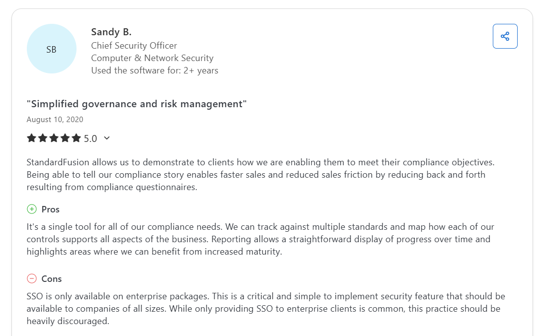 As GRC programs mature and expand across multiple functions, standards and geographies, some users find that StandardFusion’s flexibility comes with trade-offs.