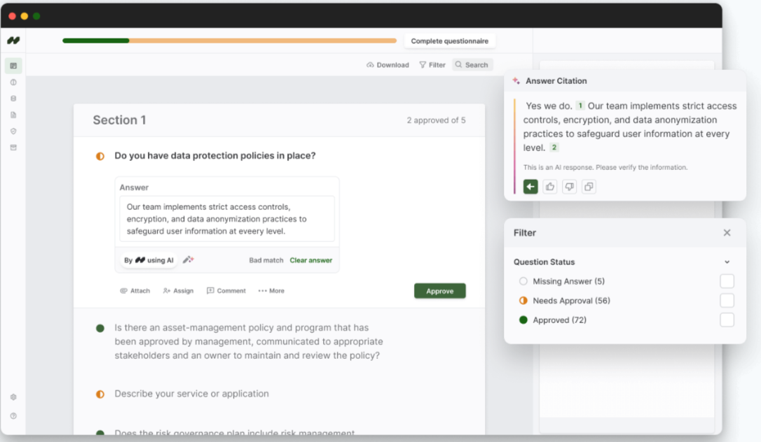 - AI-powered compliance automation: Streamlines compliance end-to-end by generating policies, suggesting control mappings, validating evidence, automating remediation, scoring risks, and accelerating vendor and questionnaire reviews.