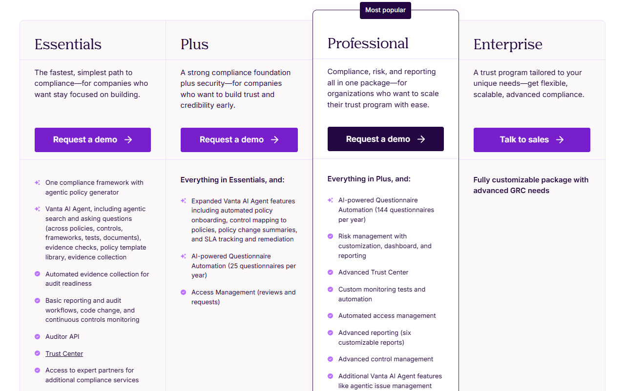 While Vanta doesn’t publish fixed pricing on its website, it offers four clearly defined packages designed for teams of various sizes and compliance needs.